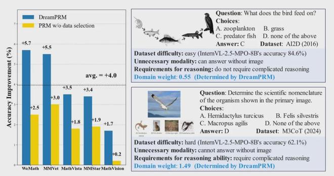 通过解决数据质量不均衡问题,DreamPRM 大幅提升了多模态过程奖励模型的性能。