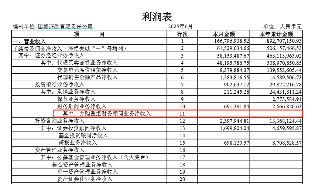 在主营业务中,投行业务上半年净收入同比增长127.71%,表现最突出。其中,今年上半年国盛证券保荐业务净收入277.36万元,较2024年同期的20.75万元增长超1200%,为投行业务贡献了最大增量。承销业务净收入2443.18万元,同比翻了三倍多。但是,今年上半年财务顾问业务净收入仅266.68万元,同比下滑近六成。同时,在并购重组交易火热的背景下,今年上半年国盛证券的并购重组财务顾问业务颗粒无收。