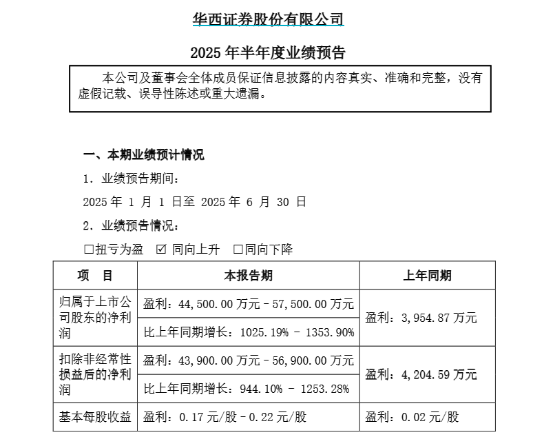 华西证券公告称,预计2025年上半年归母净利润4.45亿~5.75亿元,同比增长1025.19%~1353.90%。扣非净利润4.39亿~5.95亿元,同比增长944.10%~1253.28%。华西证券表示,2025年上半年其按照特色化、差异化的发展方向,持续完善业务组织体系和商业模式,加强经营管理,积极把握市场机遇,强化合规风险管控,有效提升资产质量,推动实现上半年营业收入和归属于上市公司股东的净利润同比增加。