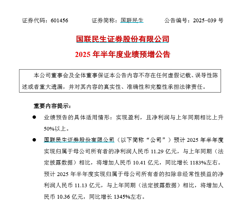 合并后首次发布半年报的国联民生证券,预计上半年归母净利润11.29亿元,同比增长约1183%;扣非净利润11.13亿元,同比增长约1345%。根据公告,今年上半年该公司的证券投资、财富管理、投资银行等业务条线实现了显著增长。同时国联民生证券也坦称:“由于上年同期比较基数较小,本期经营业绩同比大幅提升。”