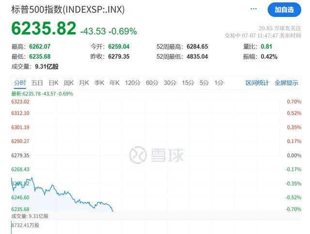 7月7日晚间,美股三大指数下跌,道指持续跳水跌近400点,纳指、标普500指数跌幅均在0.7%左右。