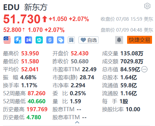格隆汇7月9日|新东方(EDU.US)盘前涨2.07%,报52.8美元。消息面上,教育部办公厅发布组织实施数字化赋能教师发展行动的通知。其中提到,组织实施数字赋能教育教学改革行动。加强教育新型基础设施建设,深化人工智能、大数据等技术在教育教学中的应用,推动教学理念、方法和模式转型,提升教育教学质量。(格隆汇)