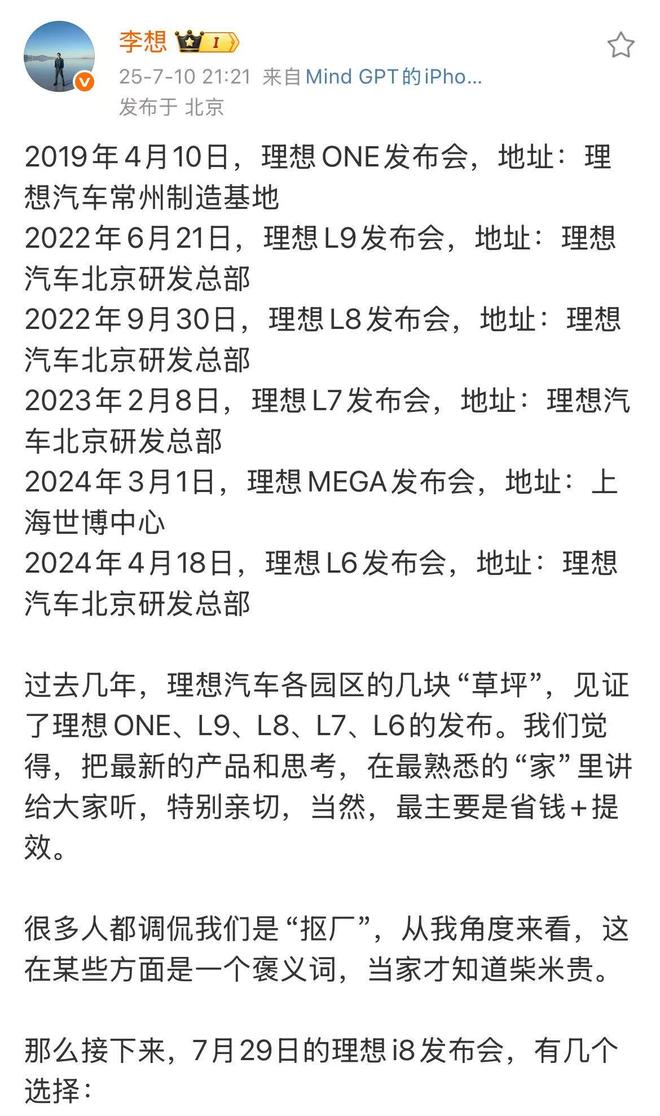 李想纠结i8发布会场地:以前总在公司草坪被调侃“抠厂”,想征求网友意见