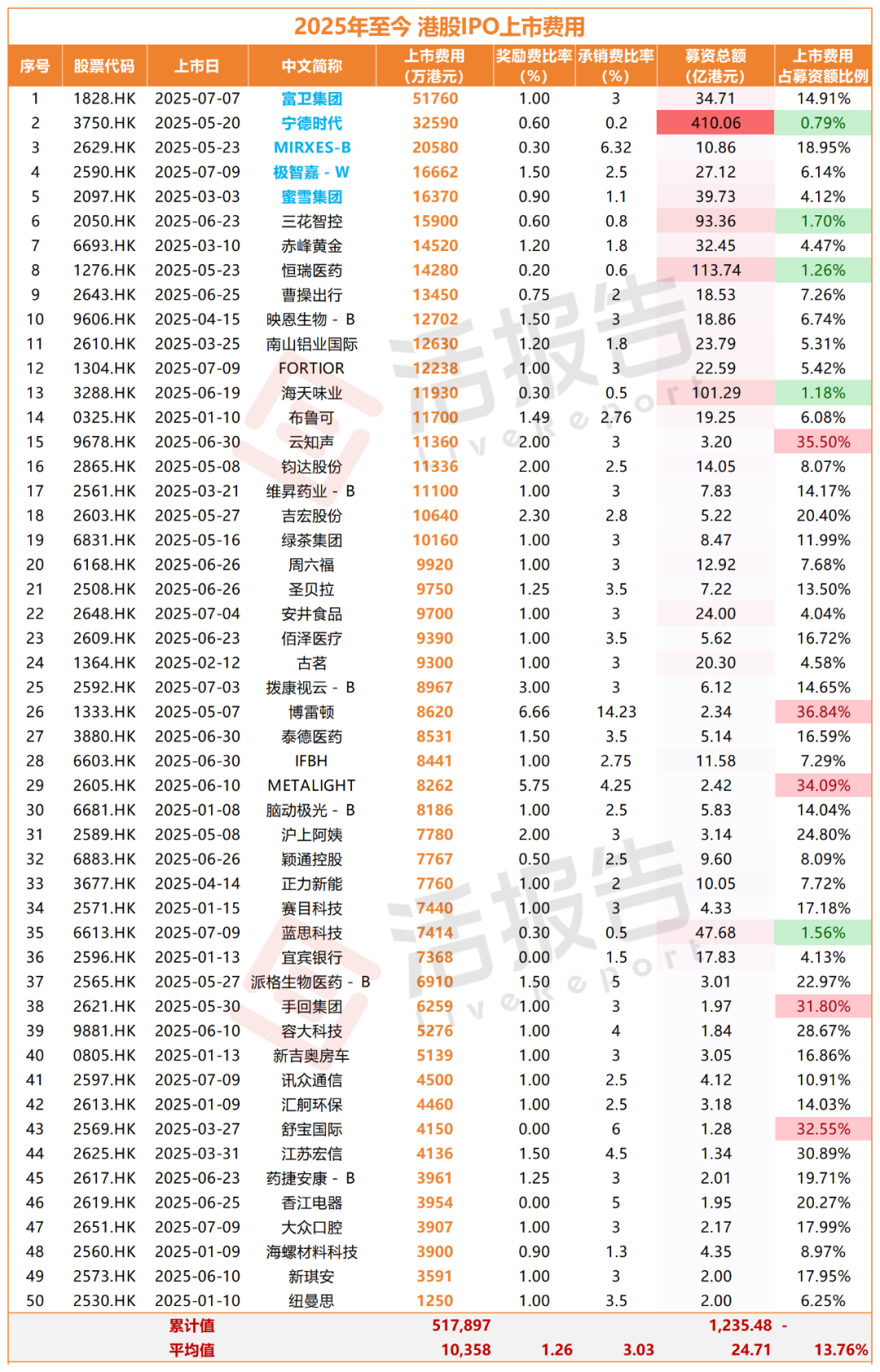 50只新股的上市费用总计约51.79亿港元,占募资总额的比例约为4.19%;平均每只新股的上市费用约1.04亿港元;平均每只新股的募资额约24.71亿港元(均值被宁德时代等大中型IPO拉高)。