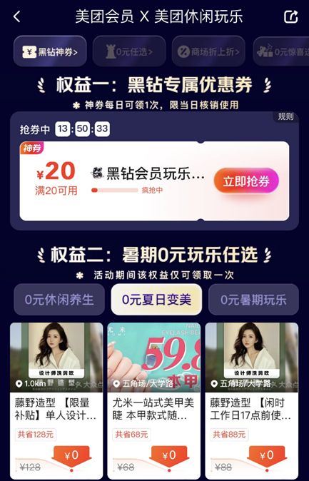 为助力暑期玩乐旺季,美团休闲玩乐联合美团会员开启0元免单、大额专属优惠券等暑期促消费专项活动。即日起至7月底,美团黑钻黑金会员可以体验0元暑期玩乐、变美、休闲养生等多种服务项目,还有多个商场折上折活动。此外,美团会员用户均可在每周五领大额无门槛专属券。