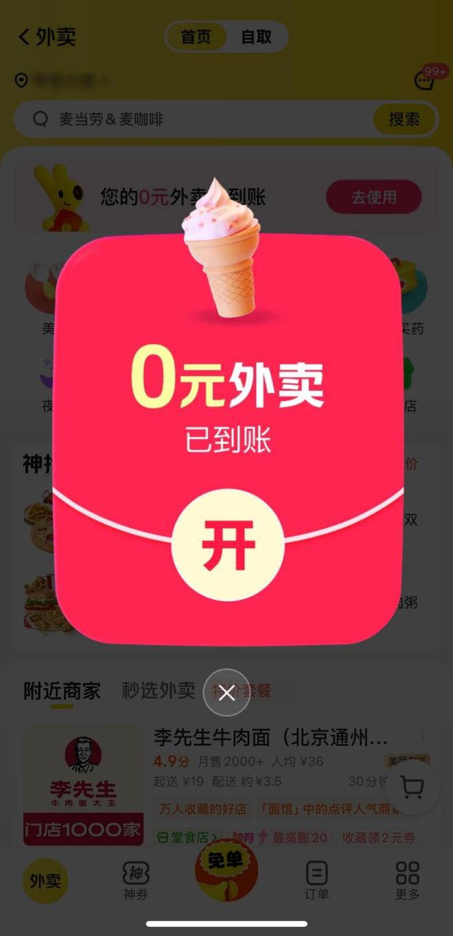 美团发放的“0元购”兑换券
