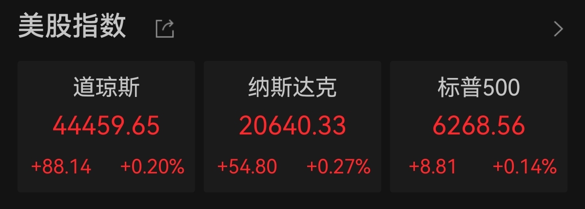 中新经纬7月15日电 美东时间周一,美股三大指数集体上涨,纳斯达克指数再创新高。截至收盘,道琼斯工业指数涨88.14点,涨幅0.20%,报44459.65点;纳斯达克指数涨54.80点,涨幅0.27%,报20640.33点;标普500指数涨8.81点,涨幅0.14%,报6268.56点。