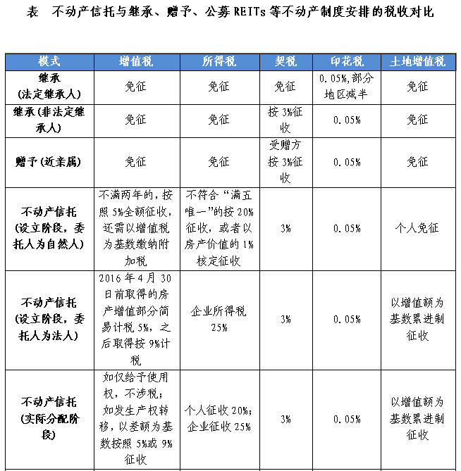 从目前京沪两地业务实践来看,不动产信托“首单”之后再无新单,主要是现行不动产信托具有两大局限:一是居民需求高度个性化带来规模不经济问题。几个“首单”委托人均为自然人,产权分散,涉及养老服务、特殊照护、房产传承、收益灵活分配等多样需求,且一些委托人采用“不动产+现金”方式。这导致产品设计难以标准化,信托公司难以集中运营管理方式提升效率。二是“视同交易”的课税原则导致信托架构产生双重税费。京沪两地不动产信托设立与分配阶段的课税标准根据财产所有者的情况进行征收。在设立阶段,委托人为自然人且“满二”“满五唯一”情况下各类税费较房产的继承与近亲属赠予20%以上,较基础设施领域不动产投资信托基金(以下简称公募REITs)高出3%以上;委托人为法人税率高出更多。在分配阶段,不动产信托仍要按照9%以上的差额缴纳增值税,税负成本高于公募REITs的3%增值税率,契税、印花税等税率也高于公募REITs(见下表)。高昂税费致使各地面临“首单之后再无新单”的尴尬局面,也导致不动产信托在供给端的使用率远低于现行公募REITs架构,原本最应成为REITs受托人的信托公司却从未发行或管理过一单REITs。