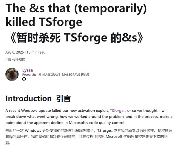 快科技7月15日消息,今年2月,知名Windows激活团队MAS推出了一种名为TSforge的激活方式,声称可以无损永久激活Windows 10/11。