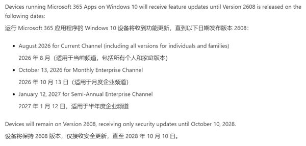 微软当时并未提供关于不同渠道将如何接收更新的详细说明,不过最近微软添加了详细说明,运行Microsoft 365应用程序的Windows 10设备将收到功能更新,直到发布2608版本: