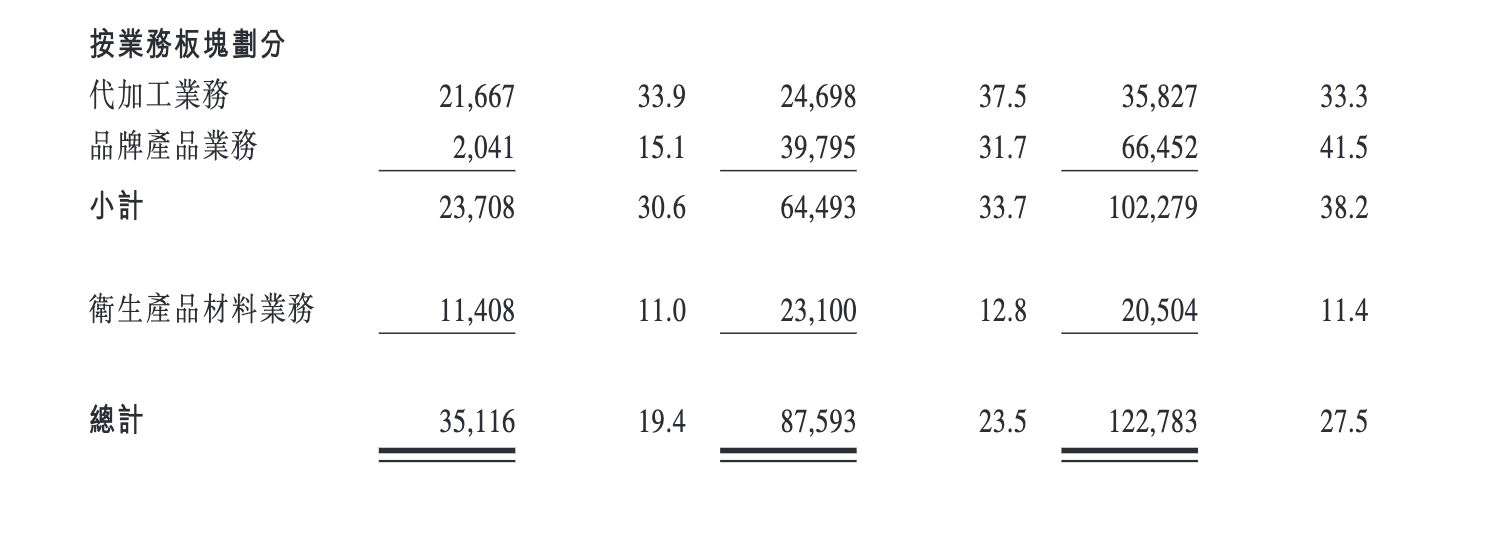 2023年以前,焦点国际是一家卫生用品代工厂,品牌收入占比较低。2022年营收1.8亿元,其中用来出口的卫生产品原材料占比近六成,而代加工业务占比将近四成,品牌产品业务仅贡献约1350万元收入。