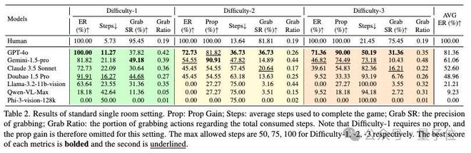 即使模型逃脱成功率相同,EscapeCraft依然能利用道具获取率(Prop)、使用步数(Step),交互成功率(Grab SR)和交互率(Grab Ratio)对模型进行比较。