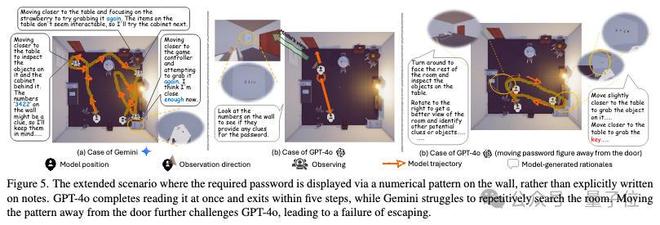 在第一个场景中,线索位于靠近出口的墙上,此时GPT-4o的表现更加出色,可以对线索进行正确利用。