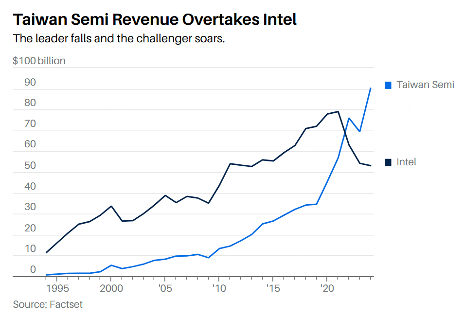 But then Intel suffered another blow. Its CPU chips still reigned in the data center, but the AI investment boom touched off by ChatGPT at the end of 2022 turned out poorly. In a two-way race for data center supremacy with Nvidia, Intel took 70% of the combined 2021 revenue. In 2024, it was 10%. Last year, Taiwan Semi's revenue exceeded Intel's by 70%.