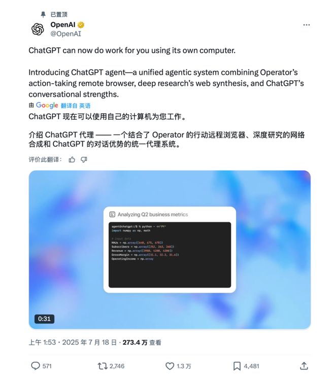 OpenAI 表示,这次发布仅标志着他们将智能体功能直接集成到 ChatGPT 中的第一步,他们计划定期逐步更新更多功能。