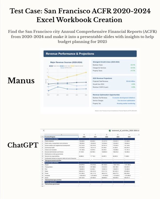 又如分析旧金山市过去四年的财务报告,OpenAI 输出的是 Excel 文件,而 Manus 给出的是包含图表与要点总结的完整演示文档。“Manus 完成的是整个项目,而不仅仅是提供数据。”Manus 评价说。