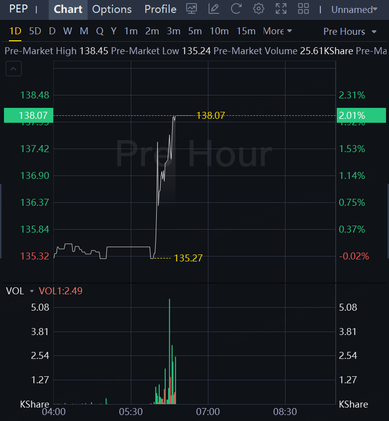 Shares of PepsiCo Inc. $(PEP)$ were climbing 2% toward a three-month high in premarket trading Thursday, after the beverage and snack giant reported surprise growth in second-quarter revenue, as volume declines slowed, and kept its full-year outlook intact.