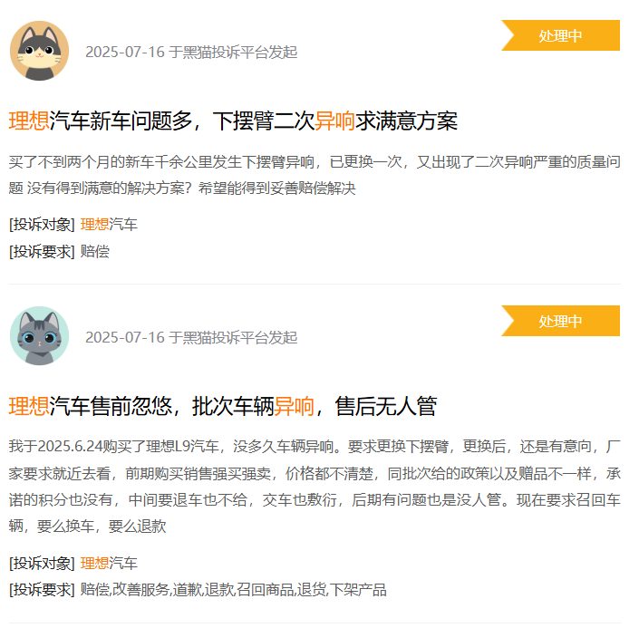 事实上,近期在多个投诉平台 【下载黑猫投诉客户端】上出现对理想汽车下摆臂异响问题的投诉。知名汽车投诉平台车质网上出现大量理想车主投诉转向系统异响与下摆臂故障问题,车型涉及理想L6、理想L7、理想L8、理想L9,问题集中表现为刚提新车转向异响严重,影响驾驶体验,去售后检查,售后要求更换下摆臂。新车就更换零件且售后没有任何补偿方案,车主不满意,希望厂商给出妥善解决方案。