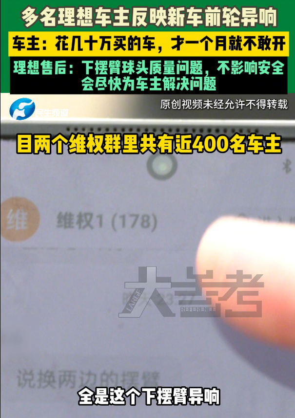 有车主表示,花几十万买的车,才一个月就不敢开。理想汽车售后表示示已找到原因,是下摆臂球头质量问题,不影响安全,会尽快为车主解决问题。但车主们对售后的处理方式和解决方案并不满意,希望厂商能给出更妥善的处理办法。据介绍,目前两个维权群里已经有近400名车主,全是这个下摆臂异响。