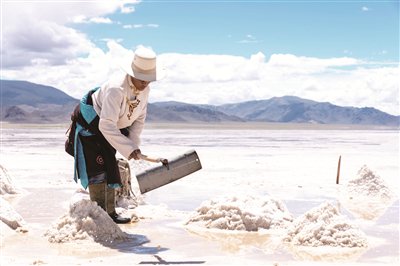 西藏阿里地区革吉县盐资源丰富。为促进村民增收,当地建起了粗盐加工厂,逐步形成采盐、储存、加工、包装和销售于一体的产业链。2018年,革吉驮盐习俗被列入西藏自治区非物质文化遗产代表性项目名录。图为革吉县牧民在采盐。