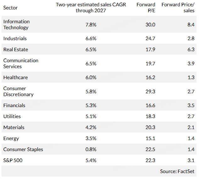The information technology sector is expected to increase revenue most rapidly from 2025 through 2027. It also trades at the highest forward P/E and the highest forward price-to-sales ratio.