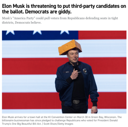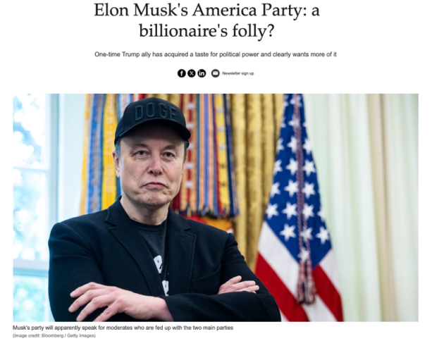 此前,马斯克宣布成立“美国党”,以挑战美国两党政治格局,结果立即引发广泛关注和争议。马斯克此举在一定程度上折射出了美国社会对现有选举制度的强烈不满与改革诉求。
