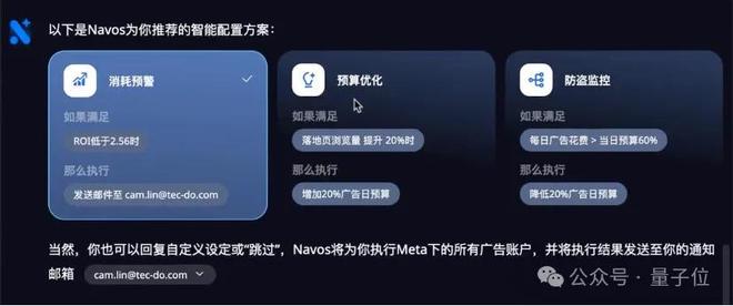 它首先提供了“补充信息确认”,比如当ROI小于2.56时发送邮件提醒,预算增加20%时采取优化动作,广告花费异常时预警等。
