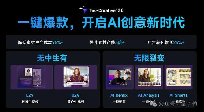 Tec-Creative 2.0这个工具,可以实现无中生有,比如链接生成视频、简介生成视频,也可以实现复杂操作一键完成,比如一键混剪、分析、高光等等。利用这个工具可以实现素材生成成本超95%的降低,素材产能提升3倍,广告转化增长达25%。