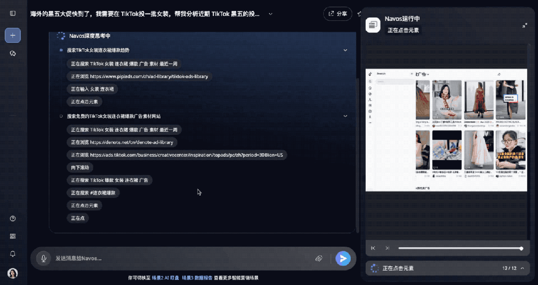 原本一个广告制作人员,想为“黑五”期间的TikTok女装广告制作创意素材,那么这项需求就可以交给Navos。