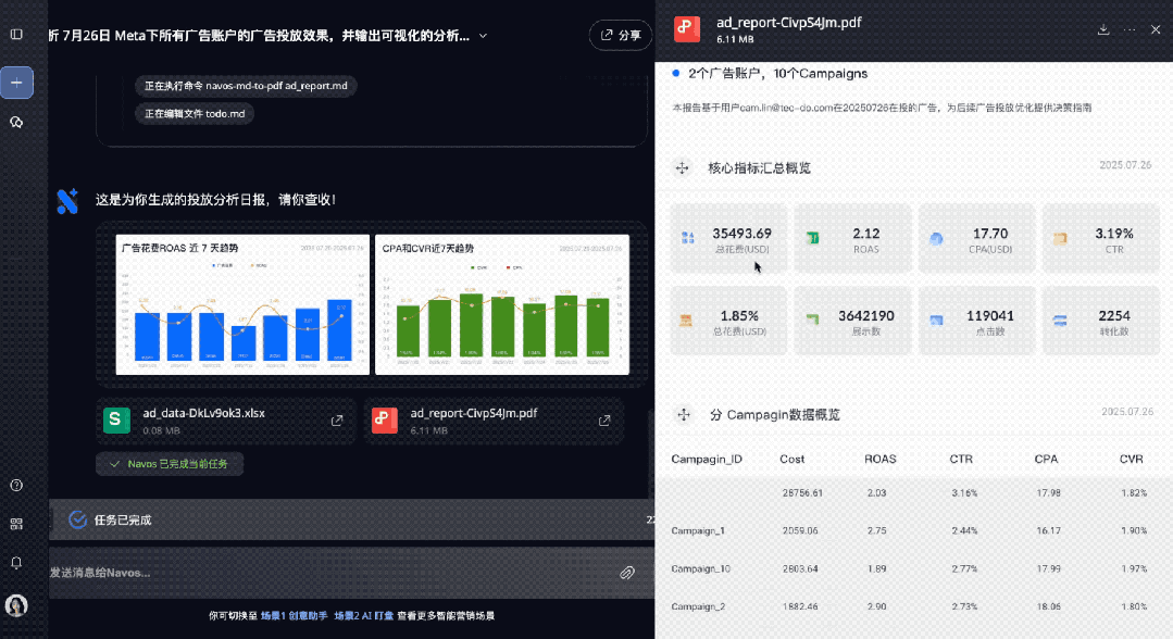 它能够基于历史表现和用户操作习惯智能制定配置方案,并成功执行任务,从而实现智能广告投放与账户管理。