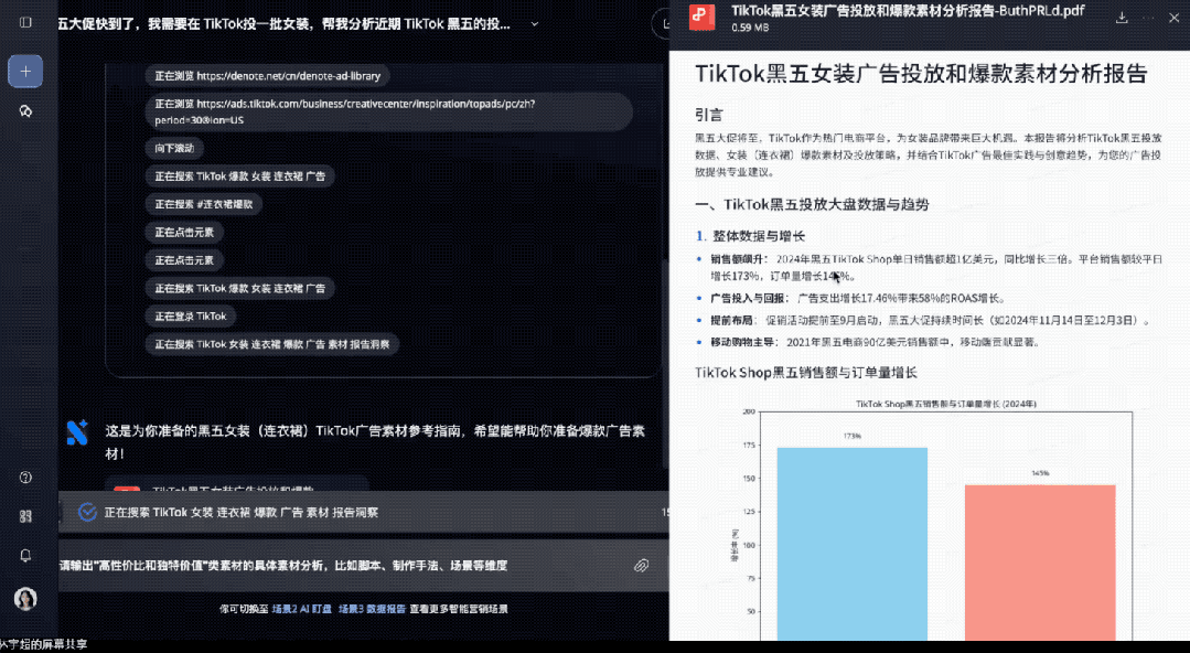 可以看到,它先梳理了思路,确定好报告中应该展示的指标和维度有哪些,然后自动撰写成报告的形式。
