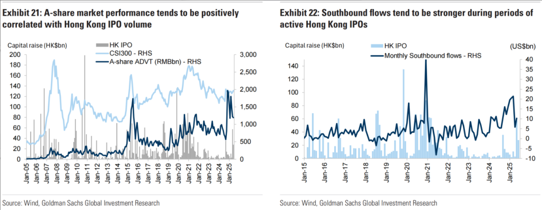 左:H股相对A股溢价情况;右:外资持股与H股估值相关性Q3. IPO 活跃是提振情绪还是消耗流动性?