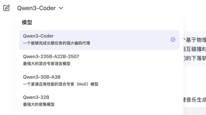 目前,如果想上手 Qwen3-Coder 的话,最直接的方式莫过于访问 chat.qwen.ai。在页面的右上角可以一键切换模型。