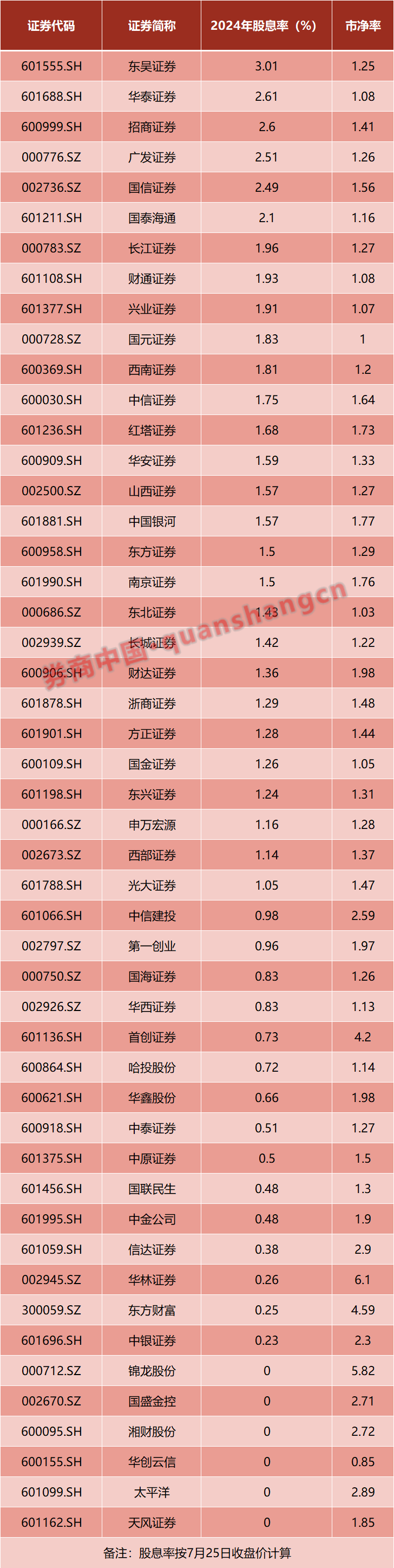 四是估值还不算太高:大多数券商股的市净率都在1倍出头,只有10家左右的上市券商市净率超过2。从分红的角度看,目前仍有6家上市券商的股息率在2%以上,超过10年期国债收益率。