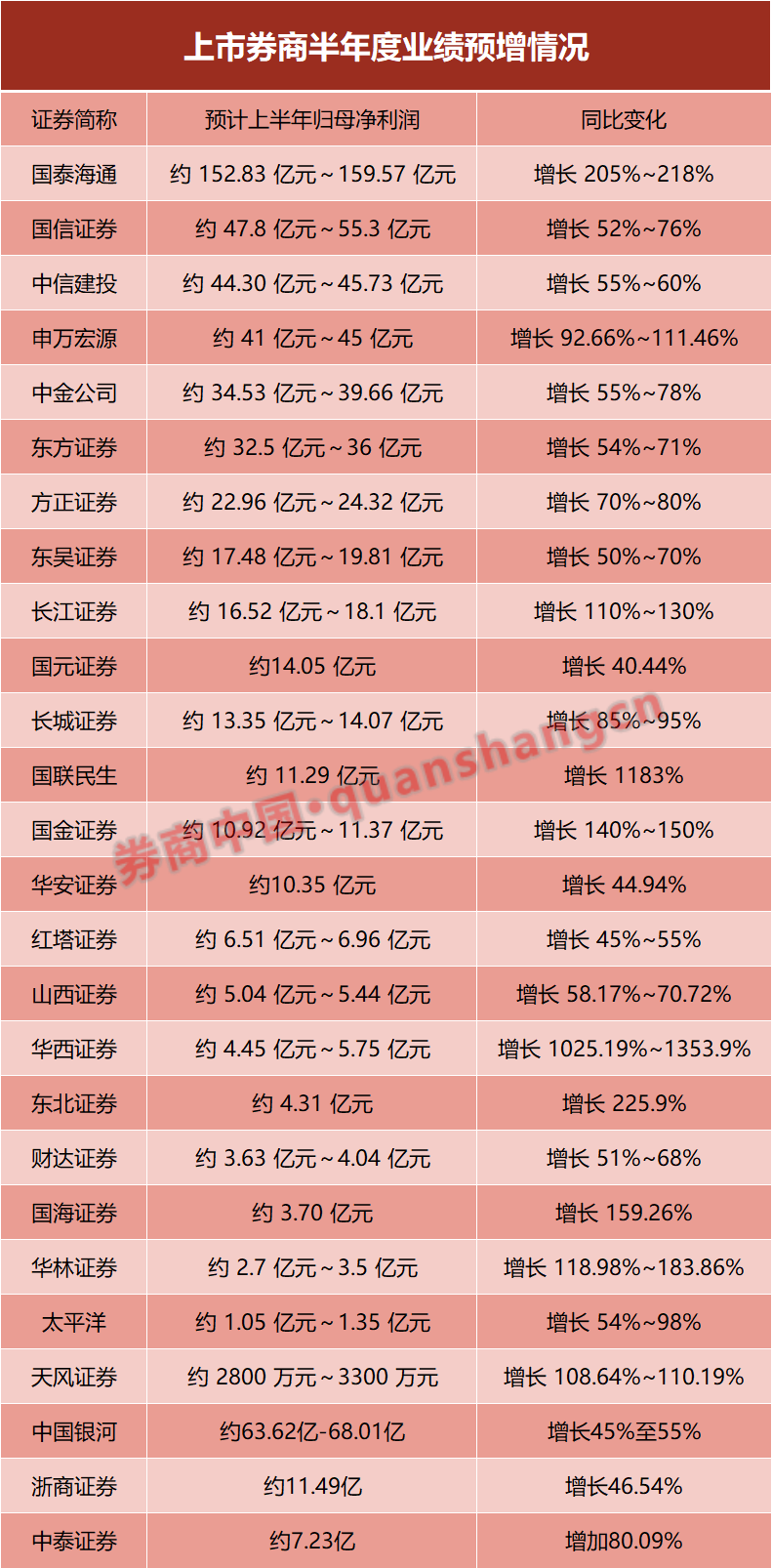 目前,至少有28家上市券商发布上半年业绩预告,归母净利润同比增长幅度最小的也有40%,绝大多数预期增长都超过了50%。