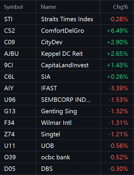 The Straits Times Index (STI), a key benchmark for the Singapore Exchange, ranged between 4,238.15 and 4,265.00 throughout the day. It ended the session at 4,261.06, down 11.99 points or 0.28% compared to Thursday's close.