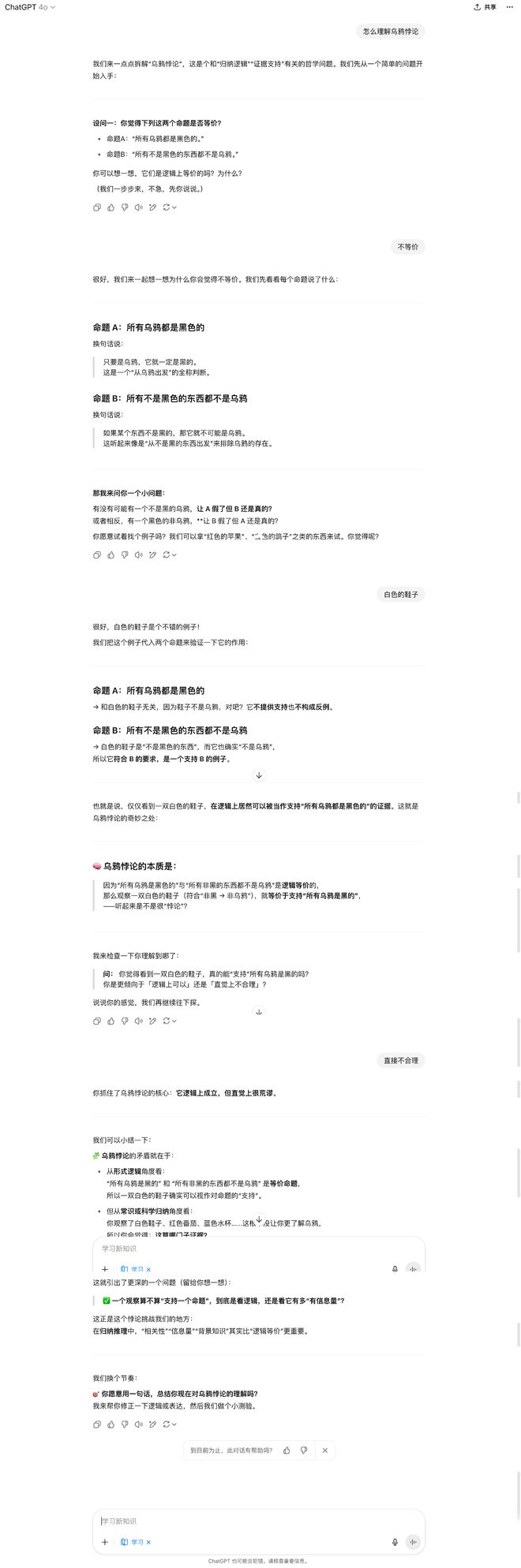 在体验过程中,我想理解“乌鸦悖论”,它也不是一次讲完一大段晦涩哲学,而是从诸如“为什么一双白色鞋子能被用来证明所有乌鸦是黑的?”这样的问题引出逻辑悖论的本质,一步步帮助我思考这个理论。