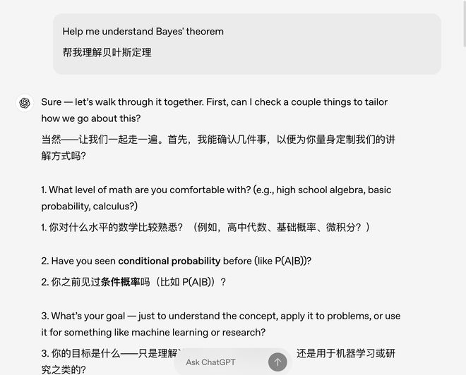 那实际体验如何?在官方演示 demo 中,当用户让 ChatGPT 讲解“贝叶斯定理”时,它就没有立刻抛出公式,反而通过需求切入,引导用户从根本上理解定理的推理路径。