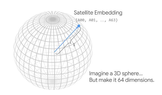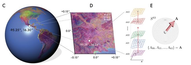 恰恰相反,AlphaEarth Foundations嵌入中单个像素的64个“波段”,代表了在一个64维“球面”上的一个64维坐标。