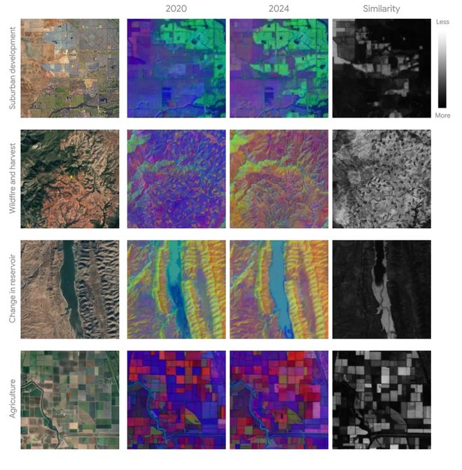 通过比较同一像素在不同年份的嵌入向量,可以轻松监测城市扩张、野火恢复、水库水位变化等。