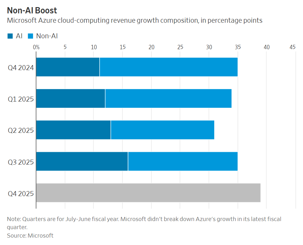 A large chunk of the recent strong growth in Microsoft’s cloud business, called Azure, stems from that. More than half of Azure’s 33% revenue jump in the company’s March quarter came from non-AI services. While the company didn’t give a comparable breakdown of the cloud unit’s 39% growth in its June quarter, it said the “core infrastructure business”—Microsoft lingo for its non-AI cloud business—was the driver.