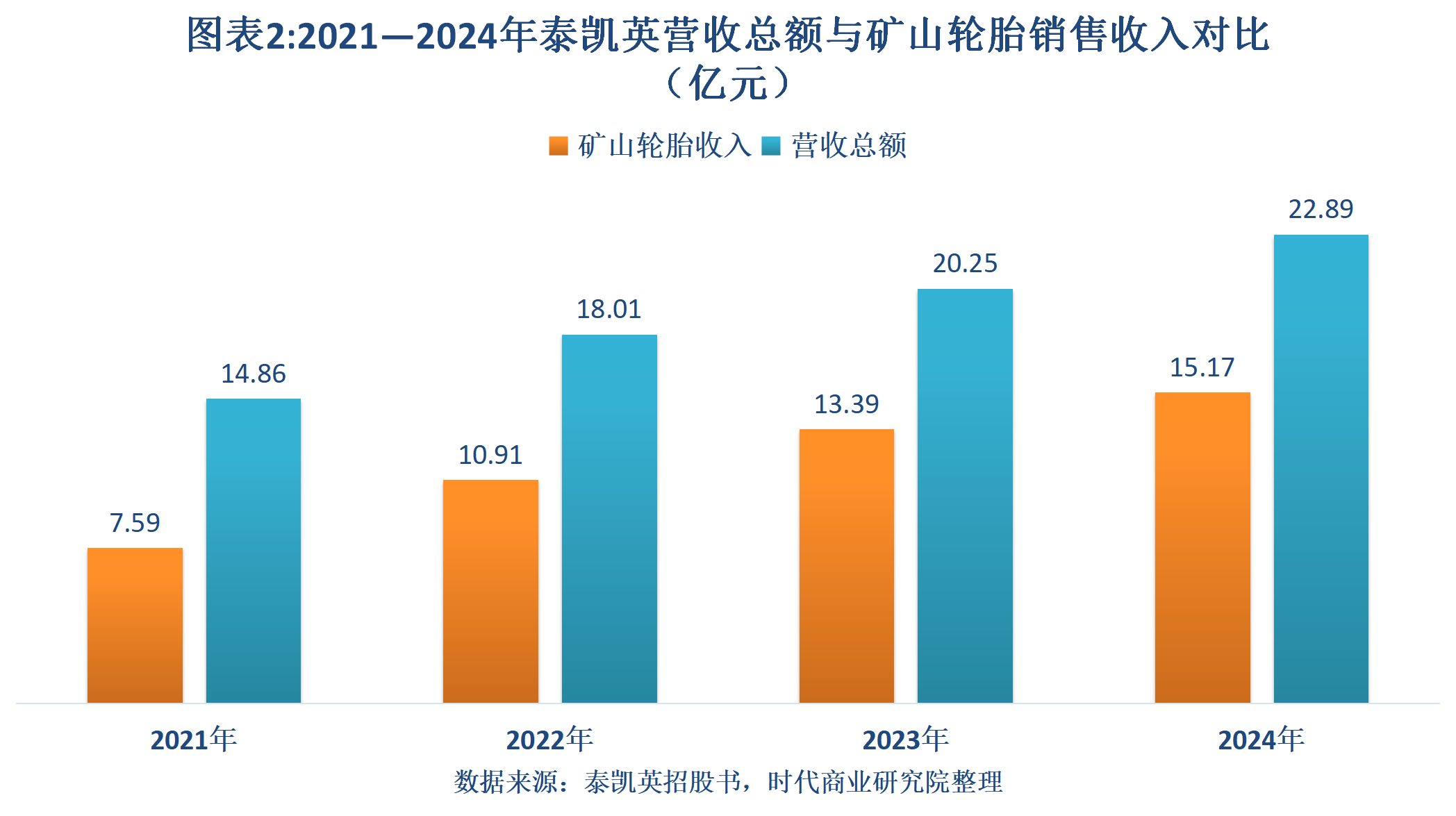 时代商业研究院根据招股书的数据测算,2022—2024年,泰凯英营收同比增加额分别为3.15亿元、2.24亿元、2.65亿元;同期,矿山轮胎销售收入同比增加额分别为3.32亿元、2.48亿元、1.78亿元,可见,矿山轮胎是泰凯英业绩增长的主要驱动力。