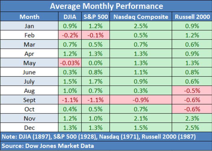 But August looks a bit better for the S&P 500 and the Dow Jones Industrial Average. Dating back to 1928, the S&P 500 has registered an average return of 0.7% in the month of August, while the blue-chip Dow has averaged a 1% increase in August since 1897. The large-cap index has ended higher 59% of the time, while the Dow has finished higher over 63% of the time, according to Dow Jones Market Data.