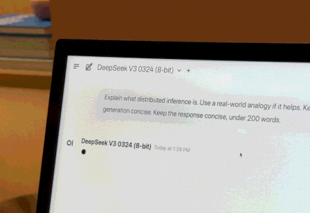并行推理:在 DeepSeek V3 仍在两台顶配 Mac Studio 上跑着的同时,又加载了同样 670 亿参数的 DeepSeek R1。系统立即将 R1 分配到剩余的两台 Mac Studio,实现两个大模型并行推理,支持多用户同时提问。