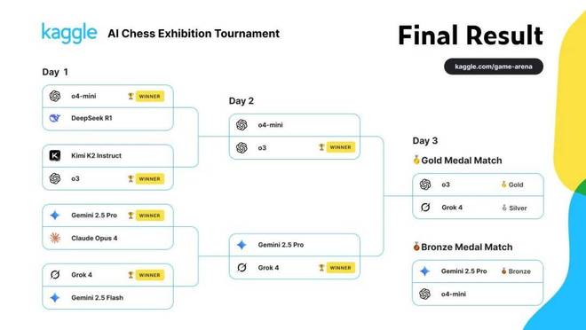 季军争夺战在谷歌 Gemini 2.5 Pro 与 OpenAI o4-mini 之间展开,虽然不像决赛结果那样悬殊,却也难称得上称势均力敌。凭借三胜一和的战绩,Gemini 最终摘得铜牌。