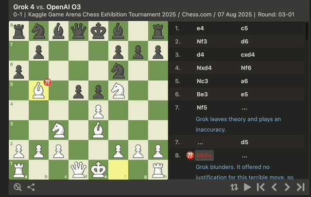 当天,Grok 4 的棋风与往日“判若两人”,频频出现低级失误,而 o3 几乎全程保持冷酷的处刑姿态。