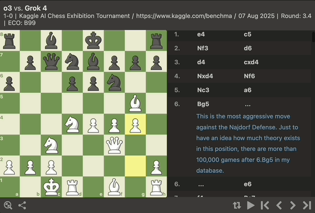 而到了 Grok 4 执白的第三局,本赛事首次出现 AI 采用西西里防御的马罗兹结构。凭借稳健的盘面,Grok 4 似乎要重拾王者风范。难道前两局的溃败只是戏耍对手吗?显然不是。