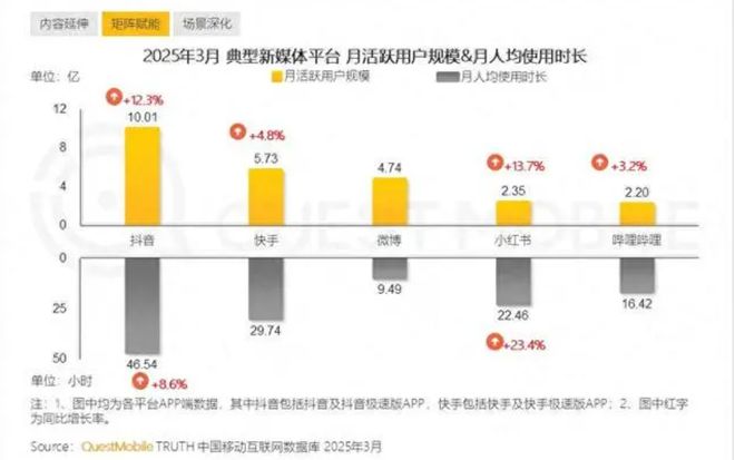 月活10亿意味着什么?同样截至2025年3月,小红书月活2.35亿,微博月活4.74亿,快手月活5.73亿,京东月活5.51亿,美团月活4.96亿,淘宝9.51亿。