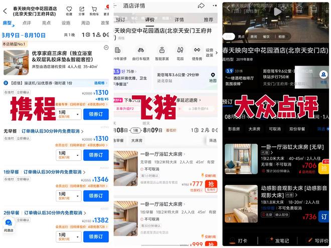 图源:时代周报记者制以8月31日该酒店的家庭三床房为例,携程显示原价1450元,实际订购价897元,差价553元;飞猪原价1646元,实际订购价1641元;抖音则报价2190元,实际订购价999元,差价最大1191元,实价居中。大众点评仅运营了大床房,并未有家庭房型。