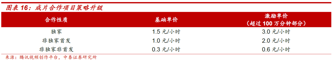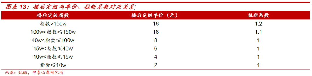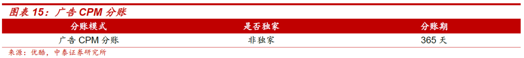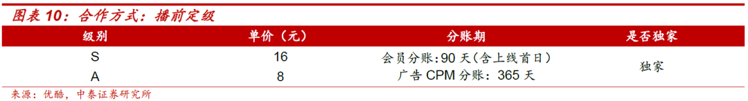 独家会员分账合作:合作方收入=会员分账期收入+广告CPM分账期收入=会员有效观看总时长/剧集时长*单价*拉新系数+(节目所产生的广告收益-平台运营成本)*分成比例。